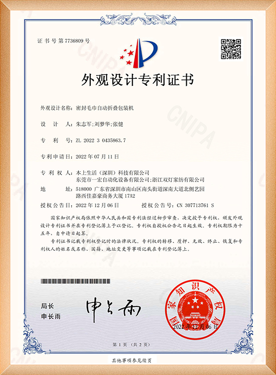本上、一宏、双灯-2022304358637密封毛巾自动折叠包装机-外观设计专利证书_00